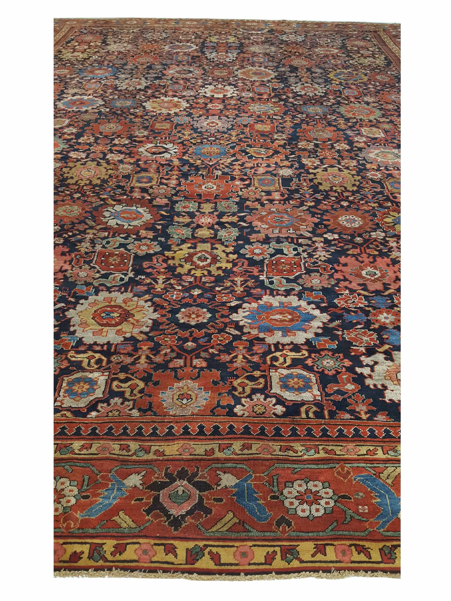 Antique Sultanabad rugs, also known as Ziegler Sultanabad rugs, are highly sought-after Persian carpets with a rich history and distinctive characteristics. Sultanabad is a region in Iran (formerly Persia), known for its long tradition of rug weaving. These rugs gained widespread popularity in the late 19th century when Western markets, particularly Europe and the United States, developed a strong demand for Persian carpets. Sultanabad rugs often feature intricate floral motifs, geometric patterns, over all or medallion designs. The color palettes are typically muted and earthy, with soft hues of blue, beige, ivory, and salmon. These rugs are handwoven using high-quality wool on a cotton foundation. They are known for their durability and craftsmanship, with tightly woven knots that contribute to their longevity. Antique Sultanabad rugs are often available in larger sizes, making them suitable for grand spaces such as living rooms, dining rooms, and ballrooms. Traditional Sultanabad rugs are dyed using natural vegetable dyes, which give them a rich, organic color palette that tends to age beautifully over time. Sultanabad rugs are renowned for their adaptability to Western tastes. During the late 19th and early 20th centuries, European and American rug dealers commissioned designs specifically tailored to appeal to Western consumers, resulting in a fusion of traditional Persian motifs with more European-inspired aesthetics. Authentic antique Sultanabad rugs are highly prized by collectors and enthusiasts. They are considered investment pieces due to their rarity, quality, and historical significance. Beyond their value as investments, Sultanabad rugs add a touch of elegance and sophistication to any interior space. Their timeless beauty and intricate designs make them prized possessions for collectors and connoisseurs of fine textiles. proper care and maintenance are crucial to preserving the beauty and integrity of these exceptional pieces of art.