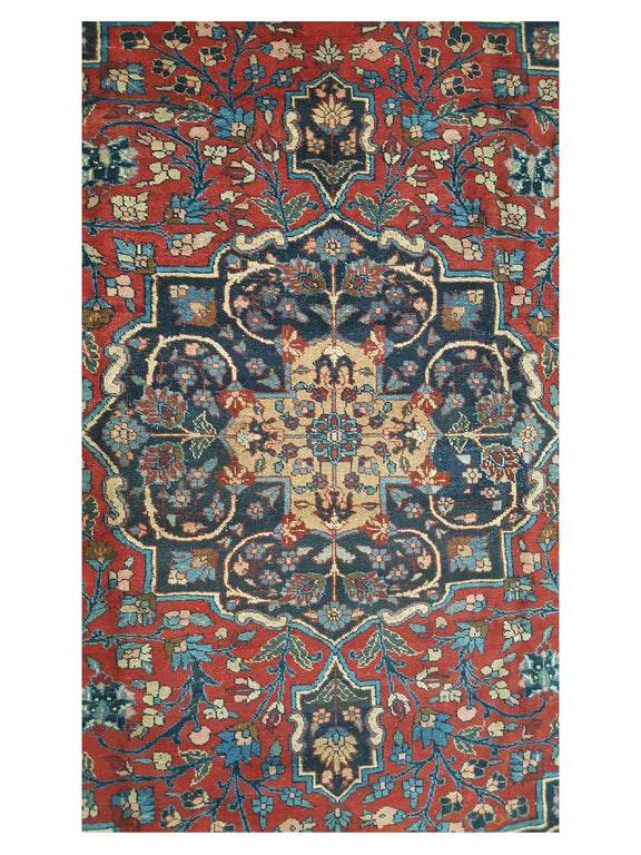 Antique Tabriz rugs often feature a wide range of designs, including intricate floral patterns, geometric motifs, medallions, and pictorial scenes. They are known for their rich color palette, which typically includes hues such as red, blue, ivory, green, and gold. These rugs are hand-knotted using high-quality wool or silk, resulting in a luxurious texture and durable construction.