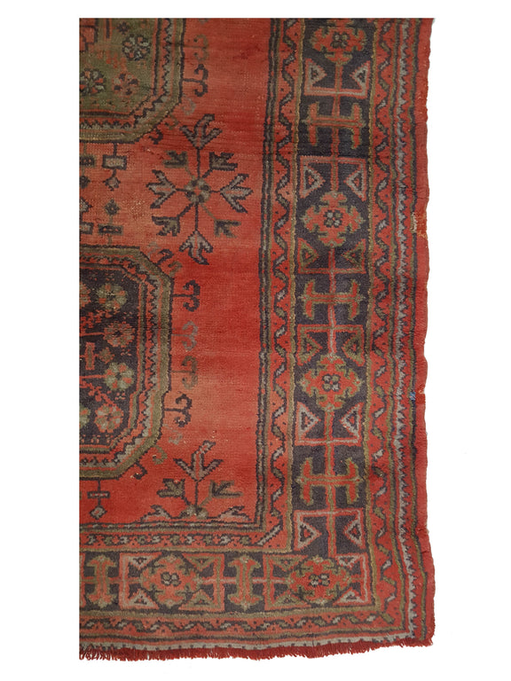 Ushak rugs are a type of Turkish rug originating from the region of Usak in western Anatolia, Turkey. They are renowned for their unique designs, high-quality craftsmanship, and rich history. Ushak rugs typically feature large-scale geometric or floral motifs in warm, earthy tones such as red, blue, gold, and beige. When referring to an "antique Ushak," it could indicate a rug produced in the Usak region several decades or even centuries ago. Antique Ushak rugs are highly prized by collectors and enthusiasts for their beauty, craftsmanship, and historical significance. They often exhibit a level of patina and wear that adds to their character and charm. Collectors and buyers of antique Ushak rugs should be aware of factors such as age and condition when evaluating their value and authenticity. Due to their age and rarity, antique Ushak rugs can command high prices in the market for fine oriental carpets and textiles.